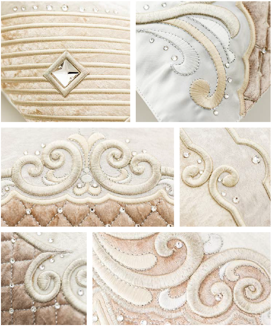 הסט מיוצר מבדי יוקרה בוהקים ועמידים במיוחד, רקמות 3D, בשילוב חוט כסף, ואבני סברובסקי נוצצים.
